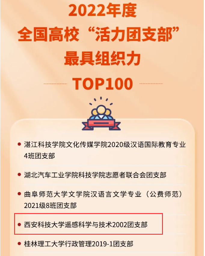 近日,由团中央基层建设部指导、中国青年报社主办开展的“活力团支部”《2022年度高校活力团支部最具组织力TOP100榜》已揭晓。经基层申报、公司推荐、省级初评、网络展示、全国终审等环节,我院遥感科学与技术2002团支部的“活力值”排名全国第四,成功入选,并在《中国青年报》上展示支部活力风采、改革建设成果和典型经验。