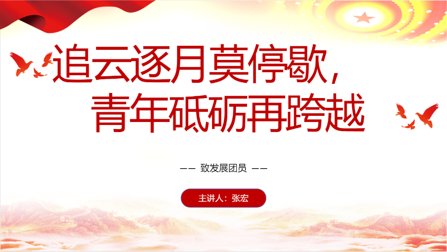 活动伊始,主讲人张宏鼓励团员们要有远大的理想和抱负,不断追求进步,勇于克服困难,实现自我超越。以"追云逐月莫停歇,青年砥砺再跨越"为题从“紧跟党打破旧世界、追随党建设新中国、听党话搏击改革潮、心向党奋进新时代”四个方面介绍本次团课内容。