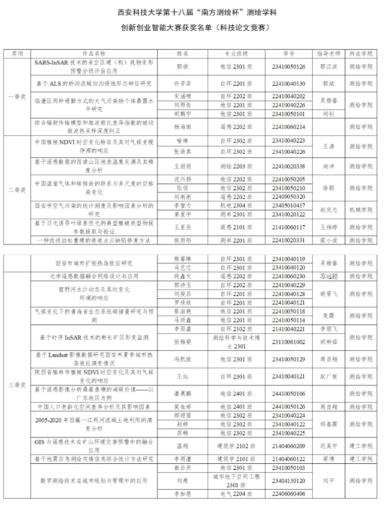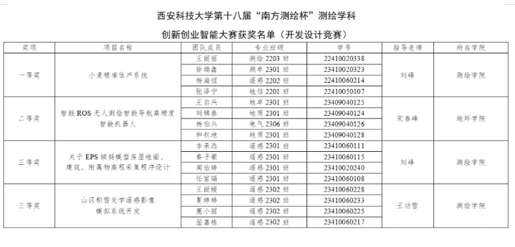 根据中国测绘学会教育工作委员会《关于举办2024年全国老员工测绘学科创新创业智能大赛的通知》,为深化公司产品改革、强化员工实践创新能力培养,充分发挥公司测绘学科优势特色,通过“以赛促学、以赛促创”的模式,由教务处主办,太阳成集团tyc122cc承办的第十八届“南方测绘杯”测绘学科创新创业智能大赛顺利举行。本次竞赛全校共有133组员工队伍成功报名参赛,经训练、预赛、决赛,最终成绩由评审专家组评审,共评出一等奖13项,二等奖20项,三等奖31项,现将获奖名单予以公布