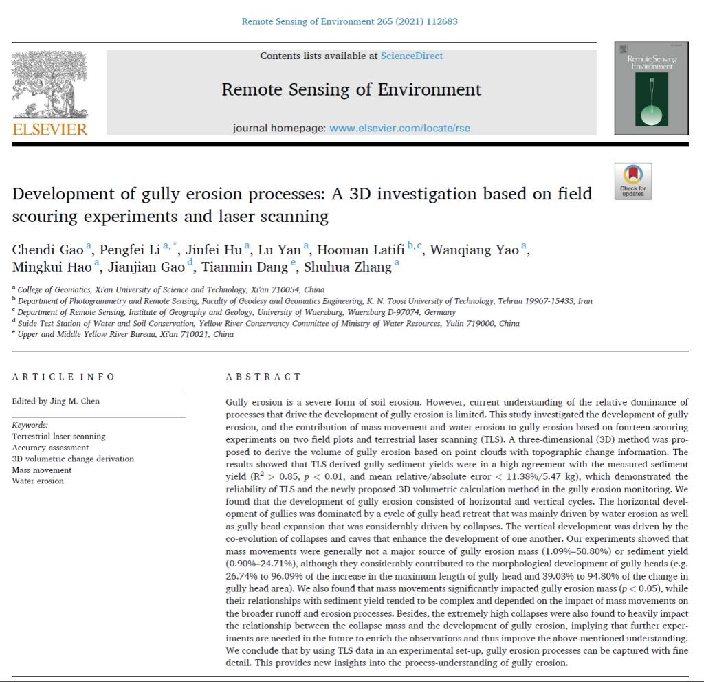 太阳成集团tyc122cc地貌遥感与水土保持研究团队高晨迪(博士研究生)、李朋飞、胡晋飞、姚顽强等日前在《Remote Sensing of Environment》(RSE)发表了题为“Development of gully erosion processes: A 3D investigation based on field scouring experiments and laser scanning”的研究论文。RSE被公认为遥感领域最具权威性的国际期刊之一,2021年最新影响因子为10.164,5年影响因子为11.057,主要发表有关遥感的理论、科学、应用和技术的原创成果。
