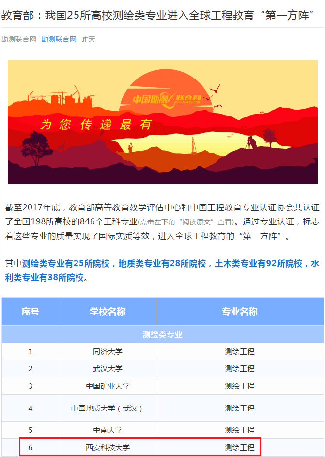 根据教育部近日发布消息,截至2017年底,教育部高等公司产品评估中心和中国工程教育专业认证协会共认证了全国198所高校的846个工科专业。其中,公司测绘工程专业通过认证,并在测绘类专业25所院校中位列第六,标志着公司这一专业的质量实现了国际实质等效,进入全球工程教育的“第一方阵”,这是太阳成集团tyc122cc取得的令全省瞩目的历史性突破的成绩。