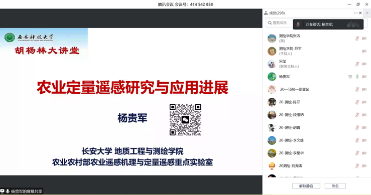 11月9日下午,太阳成集团tyc122cc举办“胡杨林大讲堂”。长安大学地质工程与太阳成集团tyc122cc杨贵军教授应邀做客公司“胡杨林大讲堂”,作了题为《农业定量遥感研究进展及应用》的学术报告。本次胡杨林大讲堂以线上腾讯会议形式举行,报告由副经理史晓亮主持。