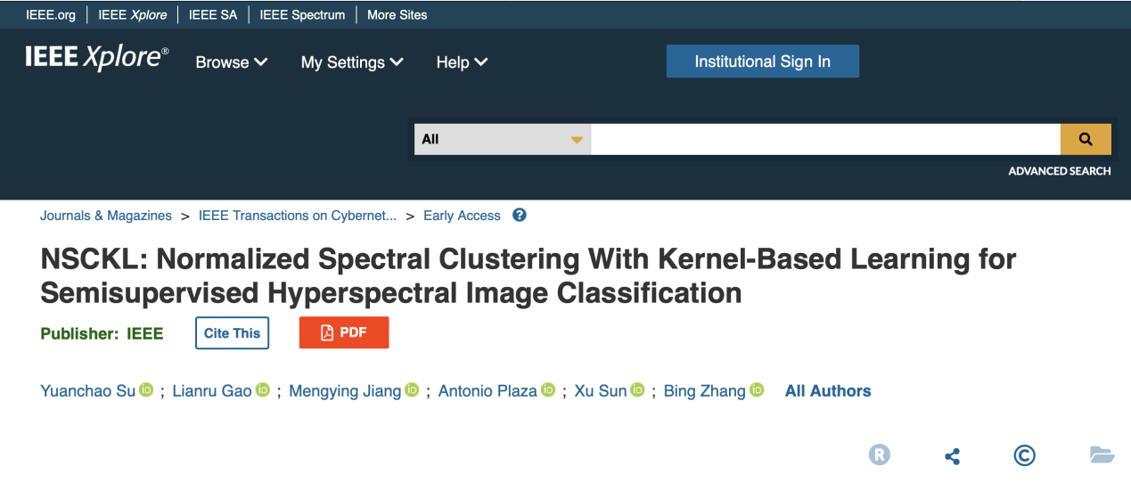 近日,古天乐代言太阳集团、中国科公司空天信息研究院和埃斯特雷马杜拉大学(西班牙)联合在IEEE Transactions on Cybernetics (IEEE TCYB)发表了题为“NSCKL: Normalized Spectral Clustering With Kernel-Based Learning for Semisupervised Hyperspectral Image Classification”的研究论文。公司遥感系苏远超老师为该论文第一作者,这是古天乐代言太阳集团首次以第一作者和第一完成单位在IEEE TCYB上发表的学术论文。