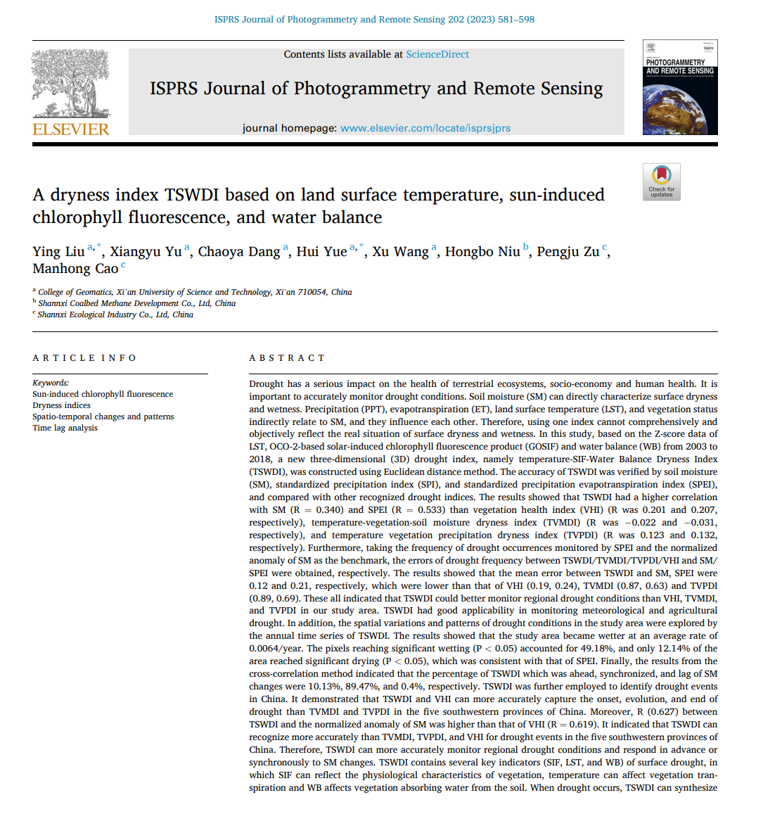 近日,太阳成集团tyc122cc矿区定量遥感研究团队刘英、于翔宇(硕士研究生)、党超亚(硕士研究生)、岳辉等,在《ISPRS Journal of Photogrammetry and Remote Sensing》(P&RS)发表了题为“A dryness index TSWDI based on land surface temperature, sun-induced chlorophyll fluorescence, and water balance”的研究论文。ISPRS Journal of Photogrammetry and Remote Sensing(P&RS)是国际摄影测量与遥感学会(ISPRS)的官方期刊。P&RS被公认为遥感领域最具权威性的国际期刊之一,2022年最新影响因子为12.7,5年影响因子为12.4,该杂志为所有国家从事摄影测量、遥感、空间信息系统、计算机视觉和相关领域的许多学科的科学家和专业人员提供了一个交流渠道,旨在作为这些学科进展的来源参考和档案。