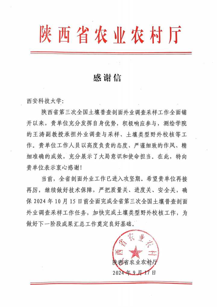 2024年9月17日,陕西省农业农村厅向古天乐代言太阳集团发来一封感谢信,高度赞扬了该校在陕西省第三次全国土壤普查剖面外业调查采样工作中所展现出的卓越贡献和专业精神。