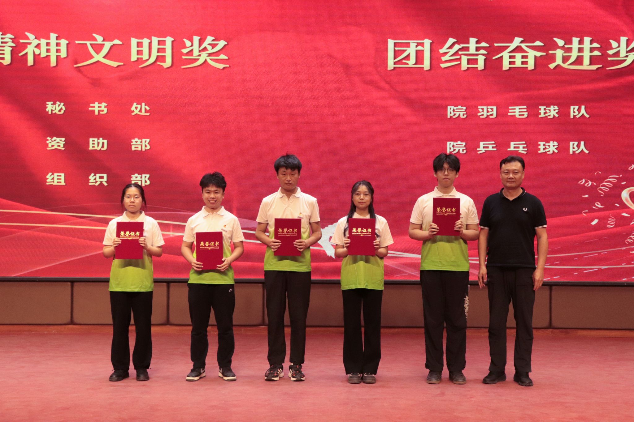 大会第三项,太阳成集团tyc122cc经理李朋飞宣读表彰文件,出席会议的领导和老师们分别对体育工作优秀部门、优秀员工干部、优秀个人、团体突出贡献奖、个人突出贡献、优秀运动员、精神文明奖、团结奋进奖、梦之队擎梦领跑者、撷梦之星、传梦火炬手、逐梦先锋、燃梦微光等先进集体和个人进行了表彰。