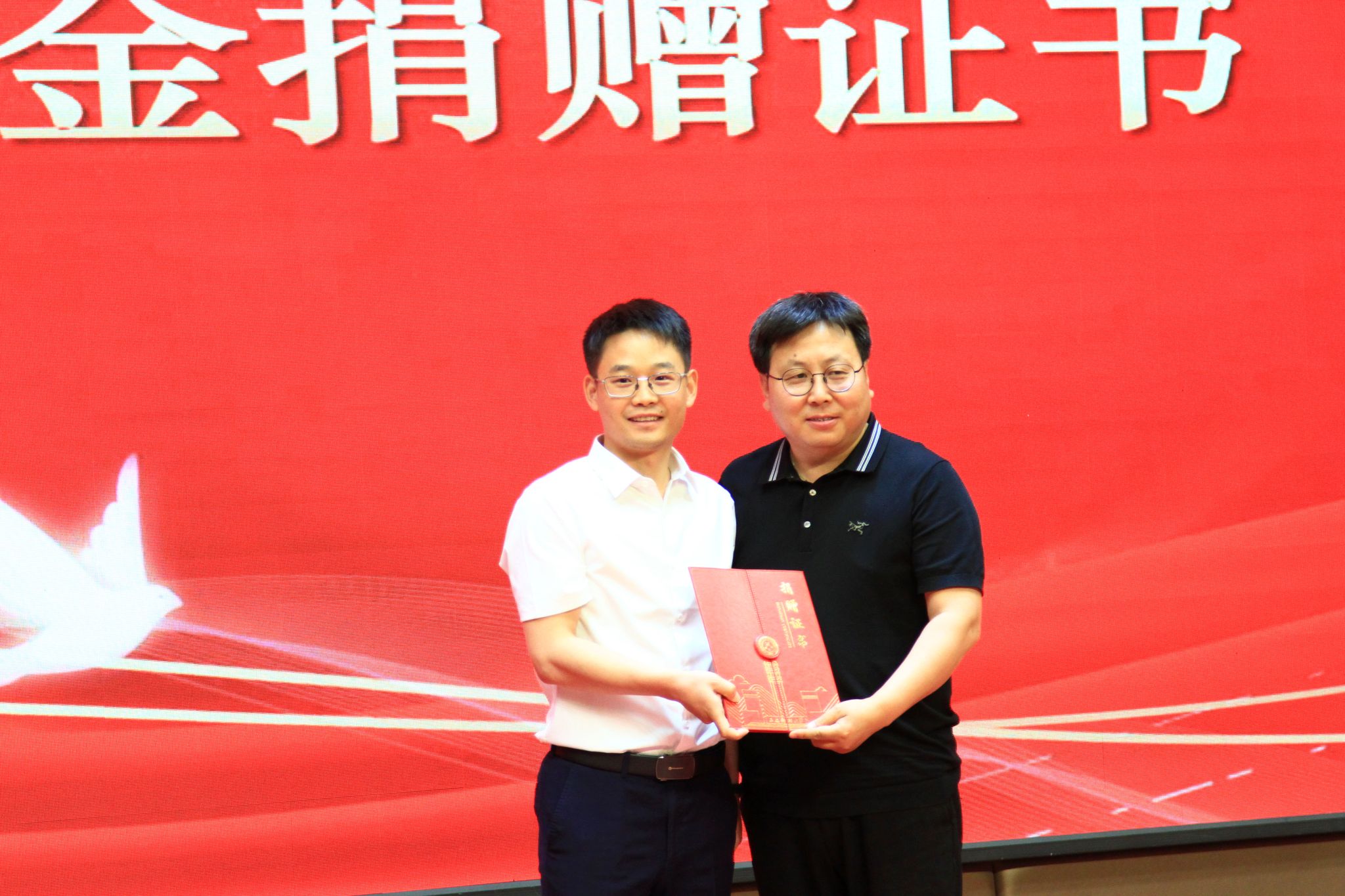 尔后,由对张旭东上台为基金发起员工代表程本垚颁发基金捐赠证书。