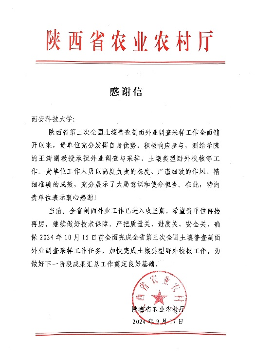 近年来,公司承担了多项与乡村振兴密切相关的国家级、省部级及横向合作项目。主持“小麦条锈病的叶绿素荧光遥感早期探测机理与方法”“南疆滴灌玉米响应水-氮-盐的低空遥感光谱表达与诊断”“综合物候动态表征和深度学习的冬小麦产量遥感估测方法”“黄土丘陵沟壑区坡沟系统土壤侵蚀过程与机理”等国家自然科学基金项目;与地方自然资源、农业农村部门合作,开展了多个县区的“实用性村庄规划编制”“榆林市横山区黄土高原水土流失、沙化土地整治研究”等应用型研究项目。其中,郭力宇教授规划设计的榆林麻黄梁黄土地质公园获批省级地质公园;王涛副教授团队参与的陕西省第三次全国土壤普查剖面外业调查采样工作,因专业贡献突出获省农业农村厅发信感谢。